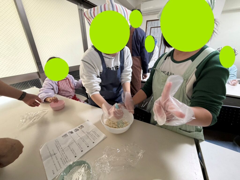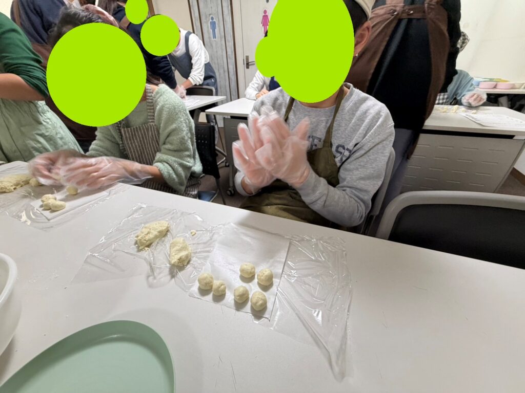 材料の計量から生地の成型までの作業を、班ごとに行いました。