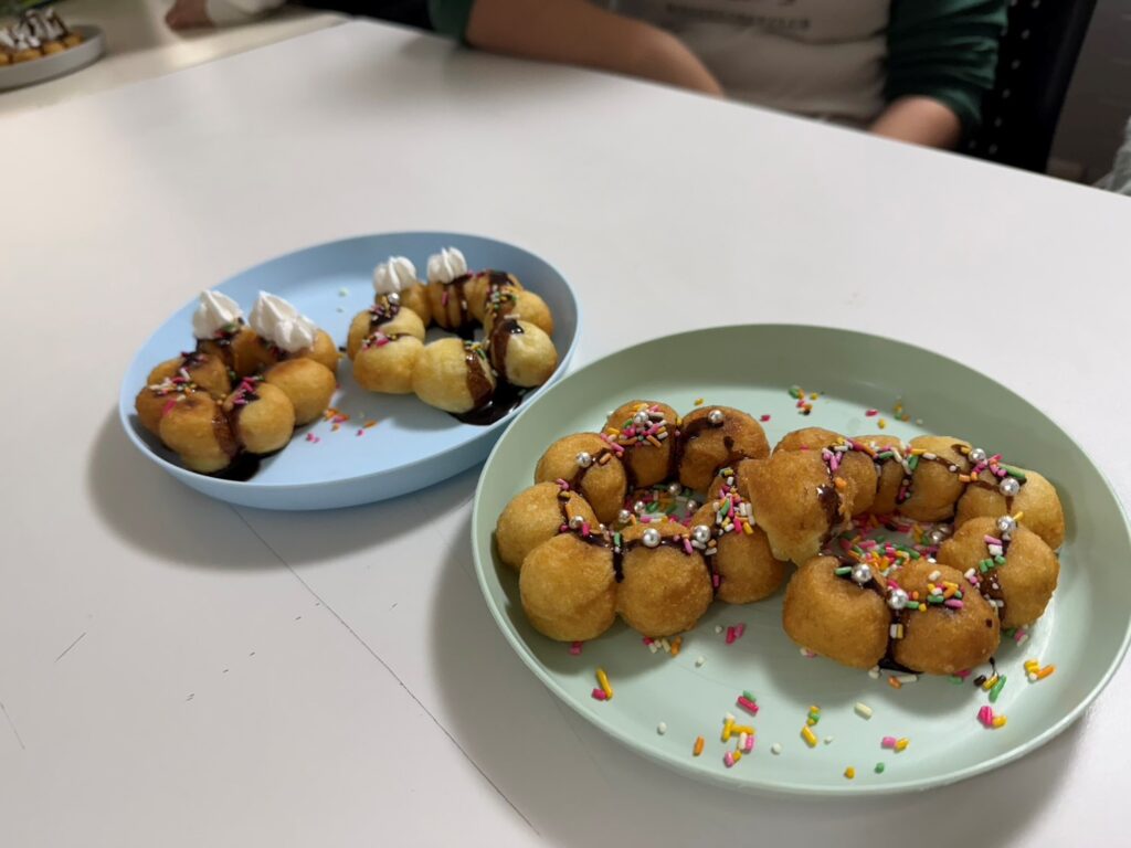 職員と一緒に油を揚げた後は、思い思いのトッピングをのせ、オリジナルドーナツの完成です✨